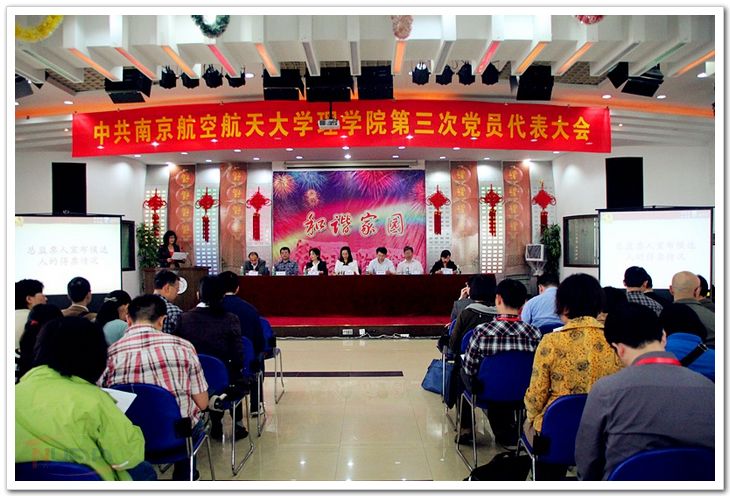 大会在庄严肃穆的国歌声中拉开序幕,王静首先汇报了此次大会筹备情况,谢瑶同志宣读了《中共南京航空航天大学委员会关于同意中共南京航空航天大学理学院委员会换届选举请示的批复》。学院党委书记余春玲同志代表中共南航理学院第二届委员会向大会作了题为《围绕中心抓党建 凝心聚力促发展》的工作报告。余春玲在报告中对学院第二届党委过去五年的工作和经验进行了回顾总结,对当前面临的形势进行了分析,提出了理学院党委今后四年的工作目标。余春玲指出,过去的五年,学院党委紧紧依靠全院党员和教职工的集体智慧和力量,团结奋进,学院事业整体推进、综合实力快速提升。面对新形势和新任务,未来几年,学院党委要紧紧围绕学校和学院的中心工作,充分发挥学院各级党组织及党员的作用,以“教学改革出亮点,理工融合探新路,内涵建设出成绩”为工作思路,以十八大精神为重点,进一步加强思想建设;以能力提升为核心,加强学院党政班子建设;以发挥作用为目标,加强基层党组织建设;坚持以人为本,推进和谐学院建设。