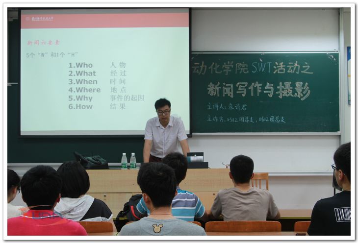 5月23日晚,由自动化学院2012级团总支主办的“新闻写作与摄影”讲座在将军路校区举行,此次讲座由能源与动力学院组宣干事、曾在《南航报》工作的朱许君老师主讲,自动化学院2012级同学参加了此次讲座。