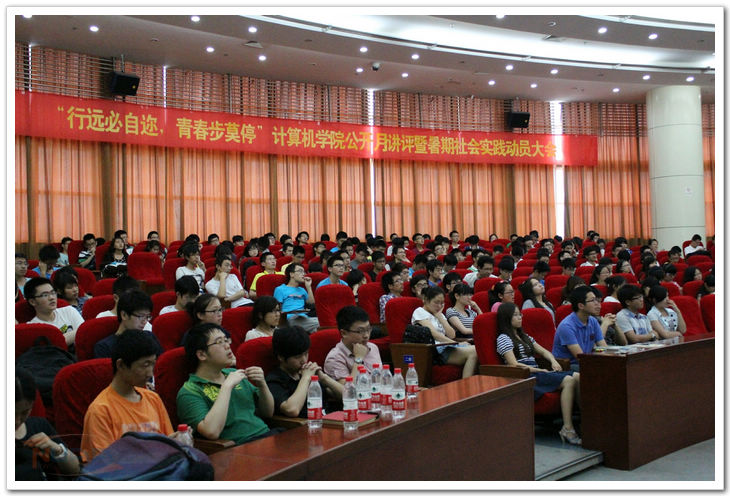 6月6日下午,“行远必自迩,青春步莫停”计算机科学与技术学院公开月讲评暨暑期社会实践动员大会在将军路校区举行。计算机科学与技术学院党委副书记王国军、学院团委书记阙愚、自动化学院2012级辅导员韩楚以及计算机学院2012级、2011级全体学生参加了活动。活动由计算机学院2012级辅导员唐志文和2011级辅导员刘彦辰主讲。