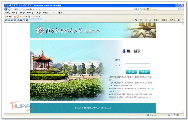 在学校相关部门通力协作和配合下,我校校园信息门户(http://urp.nuaa.edu.cn)经过3个多月的测试运行,于6月27日正式上线。