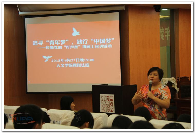 6月27日晚,由人文学院传播党的“好声音”博硕士宣讲团筹备两个多月的首个宣讲会在将军路校区举行,人文学院团委书记、研究生辅导员尹春苹参加了此次活动。