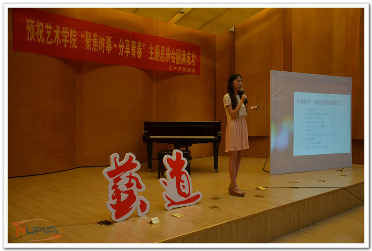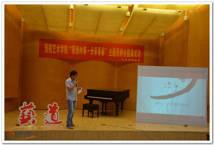 6月19日晚,艺术学院“聚焦时事分享青春”主题思辨会在音乐厅举行。艺术学院团委书记雷蕾老师作为嘉宾参加了本次活动。 本着“聚焦时事分享青春”的原则,思辨会结合当下诸如“复旦投毒案”、“高考”等热点词汇,由主讲人进行抛砖引玉,引导观众对社会关注度较高的话题进行思考,并形成带有辩论性质的互动。据本次活动主持人、艺术学院学生会主席介绍:“思辨会旨在营造一种开放自由的环境,给当代大学生一些独立思考的空间。”