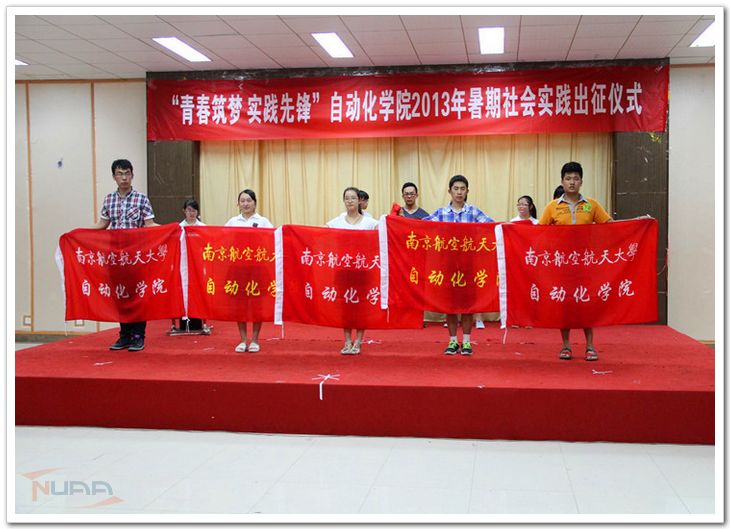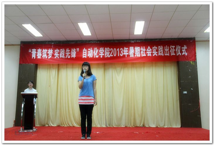 7月2日晚,自动化学院“青春筑梦 实践先锋”暑期社会实践出征仪式在多功能厅举行。12级辅导员田立丰、韩楚老师,10级辅导员陈华华、晏辞老师,以及院团委副书记袁琬欣同学和各实践团队的代表参加了本次活动。 本次出征仪式的主题是“青春筑梦 实践先锋”。活动开始后,田立丰老师介绍了实践活动的前期开展情况,包括启动仪式、立项申报、两期培训、以及相关微信平台的建立完善等工作。此外,田老师还特意强调了社会实践的重要性,希望同学们能认真对待,充实自我,有所收获。随后,每个团队的队长也依次走上舞台,介绍了自己的团队,呼喊出自己的口号,充分展现了我院暑期社会实践的多样性和精彩度。他们郑重地从老师手中接过了旗帜,会场红旗熠熠,掌声不绝,将气氛推向了高潮。出征仪式的最后,所有团队代表起立宣誓,表达了认真对待本次社会实践的信心和为学院争光的决心。 ![]() ![]() ![]() ![]()