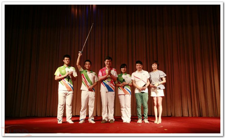 最后,南航志愿者服务的南京国际博览中心场馆还为南航准备了一个特别的礼物——有伦敦奥运会击剑冠军骆晓娟、许安琪签名的重剑。赠剑仪式由团市委副书记吕璟赠给志愿者代表,并合影留念。吕书记充分肯定了南航志愿者的努力,并夸奖了志愿者们的工作,同时也表达了对志愿者的期许,希望大家能给自己的青春留下美好回忆,努力拼搏。