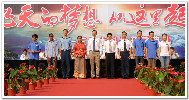在聆听了老师和学长的发言后,经济与管理学院学生刘婷炜等8名新生代表围绕着“飞天的梦想,从这里起航”主题抒发了自己在南航努力学习,志在超越的决心。党委书记崔锐捷和校长聂宏为新生代表佩戴了校徽,台下全体新生共同佩戴起南航校徽,宣告自己真正成为了一名南航人!新生代表刘洵良同学带领全体新生进行了入学宣誓,嘹亮的宣誓声展现出新生蓬勃的朝气和饱满的信心。 典礼最后,校领导与全体本科新生合唱了《南京航空航天大学校歌》,在校歌雄壮的旋律中,“飞天的梦想,从这里起航”南京航空航天大学2013级本科生开学典礼圆满结束。搭载着4512名新生梦想的航模飞机一飞冲天,新一届的南航人必将在这片天空飞的更远,飞的更高! ![]() 校党委书记崔锐捷、校长聂宏与新生代表合影 ![]() 校党委书记崔锐捷为新生代表佩戴校徽 ![]() 校长聂宏讲话 ![]() 党委副书记、副校长陈夏初主持开学典礼 ![]() 各学院院长致辞 ![]() 泰州中学校长蒋建华教授作为中学校长代表寄语新生 ![]() 新生代表做主题发言 ![]() 全体新生宣誓