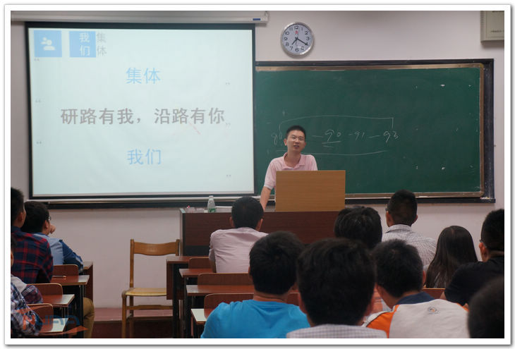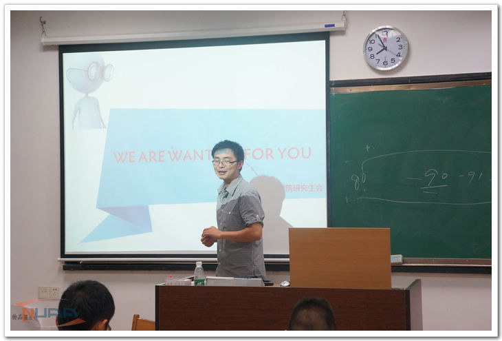 接下来,研会副主席刘振亚通过本科经历拉近了与大家的关系。分模块地为大家介绍了研会承办的主要活动、研会主办的趣味活动及研会主办的创意活动等。他敏捷的思维、幽默的说话方式让大家在欢声笑语中轻松地听完了他的演讲。通过他的演讲,大家知道了研究生期间大体上有哪些学术活动、文艺活动、体育活动及其他事件,这为他们对自己未来规划提供了有效信息和参考。