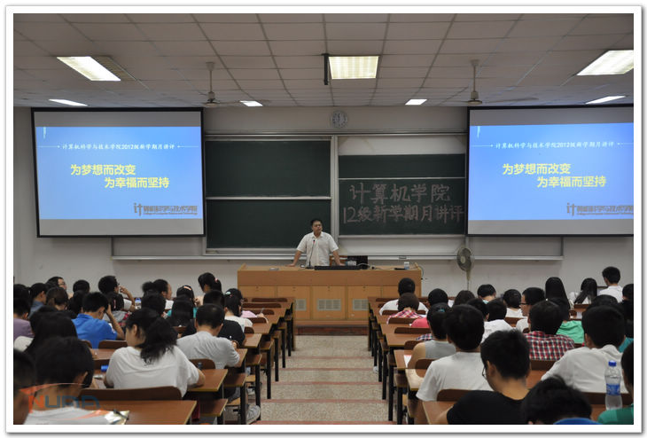 9月12日晚,计算机科学与技术学院2012级新学期月讲评在将军路校区4102教室开讲。本次月讲评以“为梦想而改变,为幸福而坚持”为主题,由学院2012级辅导员主讲。 月讲评共分为三个环节,即“再回首”、“看今朝”、“思未来”。在第一环节,辅导员用一段回顾大一学年的视频向同学们展示了一年来一起度过的美好时光,并系统总结了同学们大一学年的学习生活情况,分析了不足之处和主要原因。在“看今朝”环节,辅导员讲诉了大二学年的主要工作计划,公布了评优评奖细则,并邀请学院教务员邹春然老师为同学们作专业学习和科创竞赛指导。 最后,辅导员以电影《中国合伙人》的片段鼓励同学们不要畏惧失败,要在失败中寻找胜利,在绝望中寻找希望,不断认识自我、完善自我、超越自我,为梦想而改变,为幸福而坚守,走好未来每一步。此外,会上还对部分违纪同学进行了通报批评,并进一步开展了安全教育和纪律教育。