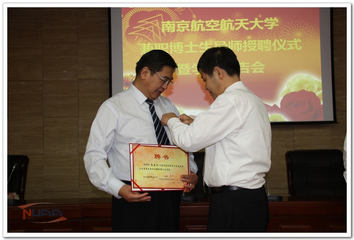 9月22日上午,我校在将军路校区举行了兼职博士生导师授聘仪式暨学术报告会。授聘仪式上,校长聂宏为高建设教授和刘洪德教授颁发了聘任证书,并佩戴了校徽。他代表学校对两位导师表示热烈的欢迎,并感谢中航工业集团多年以来对学校的支持。研究生院常务副院长夏品奇向两位导师赠送了《博士质量》等两本书。