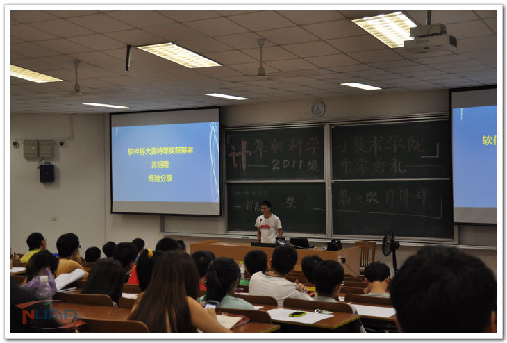 9月26日晚,计算机科学与技术学院2011级新学期主题月讲评在将军路校区举行。本次月讲评以“新起点,新征程”为主题,会议由2011级本科生辅导员刘彦辰主讲。 刘彦辰以“空想者、计划者、实践者”的一则故事拉开了大会的序幕。他指出人生不是赢在起点,而是赢在转折点,借此来激励学生们善于创造机会,踏实前行。月讲评共分为三个环节,即“2012-2013学年成绩分析统计”、“我的未来我做主”智慧加油站、“年级综合测评、评优评奖工作布置”。在第一部分中,辅导员总结分析了年级一学年的学分绩点情况,对位列年级绩点前十名的同学和在第二届中国软件杯软件设计大赛中获奖同学进行了年级通令嘉奖,同时邀请大赛特等奖获得者翁祖建发表成功感言。他表示只要学术作风踏实勤恳、认真严谨,就能在科创上获得真正的成就。
