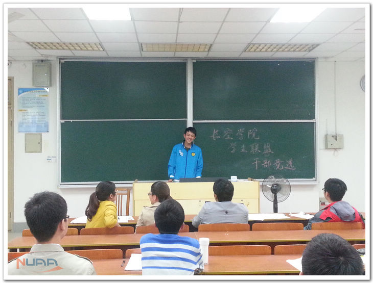 10月15日, 南航长空学院学生联盟干部竞选活动在将军路校区举行。本次竞选邀请教务处、电子信息工程学院以及材料科学与技术学院等5名老师担任评委。 此次竞选采取学生自由演说的形式进行,评委老师主要根据竞选学生的语言表达、竞选优势、工作设想以及提问环节单独打分,最后得出总分。竞选者对自身竞选的职位展开了合理规划,对学生联盟的运行、管理提出了很多宝贵的意见。
