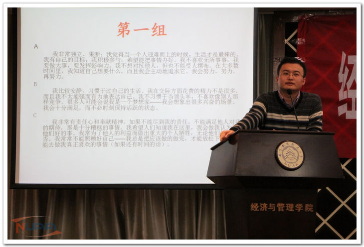 授课中,丁荣茂老师深入浅出的跟学员讲述了中国梦的内涵,南航几代人为实现高水平研究型大学梦想所作的奋斗,激励经管学子 “仰望星空,脚踏实地”;裴宇晶老师激情慷慨的给学员们分析人的九种性格,教会学员明白自己个性接纳自己的短处、活出自己的长处,懂得如何与不同的人交往沟通及融洽相处,与别人建立更和谐的关系;徐川老师则向学员介绍了从古至今的中国传统文化,幽默风趣的语言一次次赢得学员们的掌声;学校八大学生组织主席们则从团干实务的角度向学员传经送宝,分享自己奋斗历程与心路;经管学院优秀研究生代表李佳兴和刘晓倜与大家分享了她们在援藏支教活动中的感受与体验,无论是西藏的教学教务工作,还是“三下乡”社会福利义工活动,她们的无私以及热情让学员们在体悟温暖真情的同时更理解到学生干部的责任与义务。