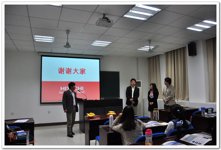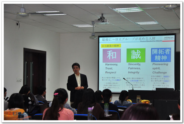 座谈会上,双方就建立学生实习实践基地和共建研究生培养基地事宜进行了探讨,并达成初步意向。宣讲会上,坂口讲述了自己多年在海外工作的奋斗经历,鼓励同学们要鼓起勇气,不畏艰难,努力实现自身的更好发展。他还详细介绍了日立公司的发展历史和现状,以及南京日立产机有限公司的经营内容和人才需要,并重点讲述了公司的创业精神及其含义。