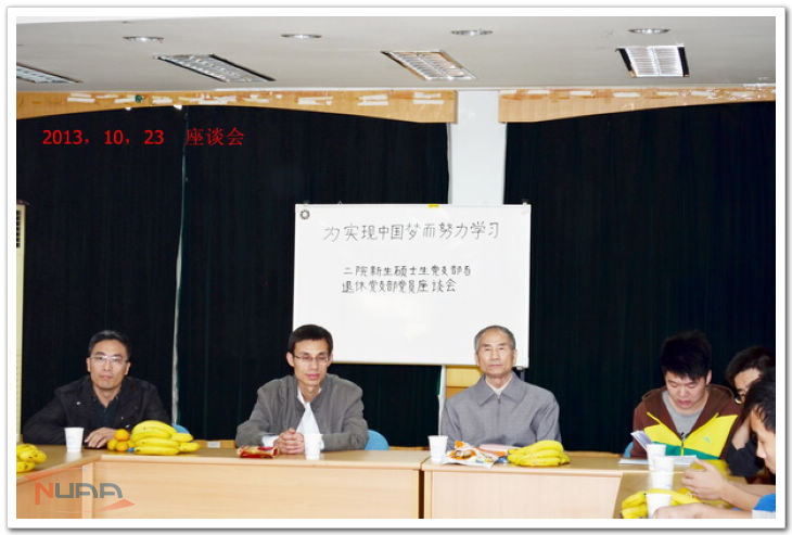 10月23日,离退休党工委退休第二党支部与二院硕士生新生党支部党员,举行了以“为实现中国梦而努力学习”为主题的座谈会。二院10名年过古稀的退休党员和17名青年党员学生齐聚一堂,进行了诚恳而深入的交流。此次活动也是上半年离退休党工委牵头的“新老南航人,共筑南航梦”离退休党支部与研究生党支部共建活动的又一次延续。离退休处处长刘虎,能源与动力学院副院长崔海涛等也参加了座谈会。