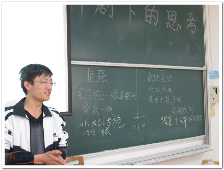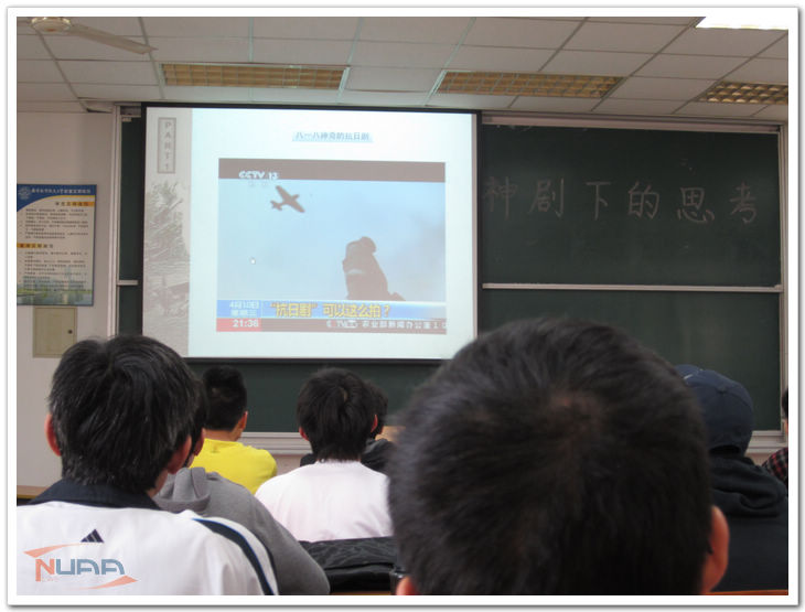 为了让同学们对活动的主题有更好的了解,主持人给大家播放了几段关于近来抗日剧的视频,如手榴弹炸落飞机的《永不磨灭的番号》,手撕日本鬼子的《抗日奇侠》等。在同学们的惊讶之余,主持人也播放了央视《新闻1+1》点评雷人抗日剧的片段,来引导大家进行思考。随后,两个团支部各有3名同学表达自己对现今电视台播出的抗日神剧的观点。有的同学对当下抗日剧的粗制滥造进行批判,表示这是对历史和先辈的不尊重,也有同学认为这无可厚非,阐述了创作者的无奈。大家各抒己见,阐明观点,现场气氛烈,台下不时爆发出阵阵掌声。