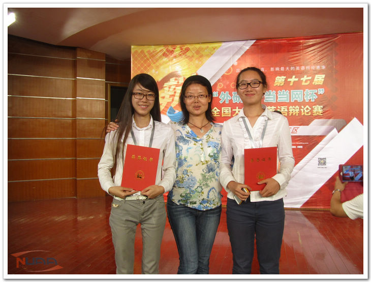 由张萍老师指导的2010级张思琪、2011级郑天艺同学在10月11-13日于江南大学举办的第17届“外研社杯”全国大学生英语辩论赛华东赛区的比赛中获得三等奖。“外研社杯”全国英语辩论赛创始于1997年,每年举办一届,是目前国内规模最大、水平最高的英语口语赛事,本届辩论赛由团中央学校部、全国学联、北京外国语大学主办,外语教学与研究出版社及中国教育电视台承办。