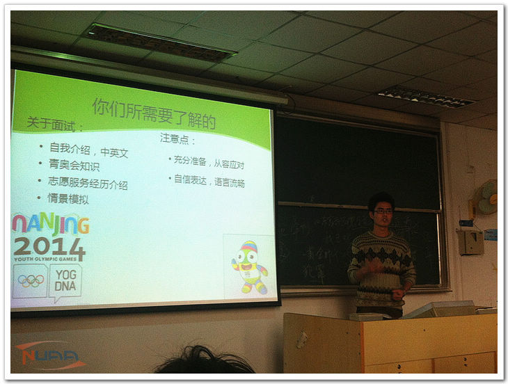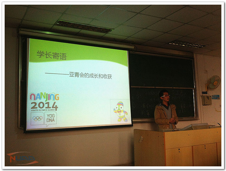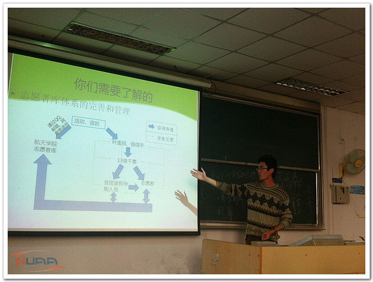 为了让航天学院的同学们更好地了解学校和学院的特色志愿服务活动,加强同学们的志愿服务意识,更好迎接青奥会的到来,在2013年11月20日,航天学院青工部面向学院2013级同学召开了志愿服务活动推介会,2012、2013级辅导员范伟参加了此次推介会。 推介会伊始,青工部部长叶逾冠为同学们简要介绍了志愿者和志愿服务的意义和定位,随后具体介绍了我院志愿者库与志愿服务奖惩制度的建设。紧接着,由青工部2013级干事马浩君、李愈嘉等同学分别介绍了地铁志愿者活动和仁智之家志愿服务活动,并进行了相关的志愿者培训。然后,进入了本次宣讲会的高潮环节,由青工部部长叶逾冠介绍2014年南京青奥会的总体情况,并由本院文艺部部长房鑫分享了参加2013年亚青会志愿服务的经验与感想,并为2013级的广大同学们送上了真诚的寄语,希望他们能在志愿服务方面做出卓越成绩,弘扬志愿服务奉献精神。
