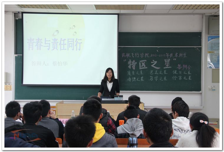 11月26日,民航/飞行学院2012-2013学年“特区之星”公开答辩会在将军路校区举行,民航学院党委副书记宋凯、团委书记傅成成、学生工作办公室主任张建辉及各年级辅导员担任答辩评委。 民航/飞行学院第二届“特区之星”的评选工作启动于11月初,经过前期的自主报名、年级推荐、学院初评,最终有25名同学成为特区之星的候选人。经过6分钟的个人展示与3分钟的现场答辩,最终评选出特区之星9人,分别是陈雨童、张若潮、郭野晨风、林萌、奚小茜、邵将、李雨吟、王雨青、马砚闻,特区之星提名奖25人,目前正在名单公示阶段。