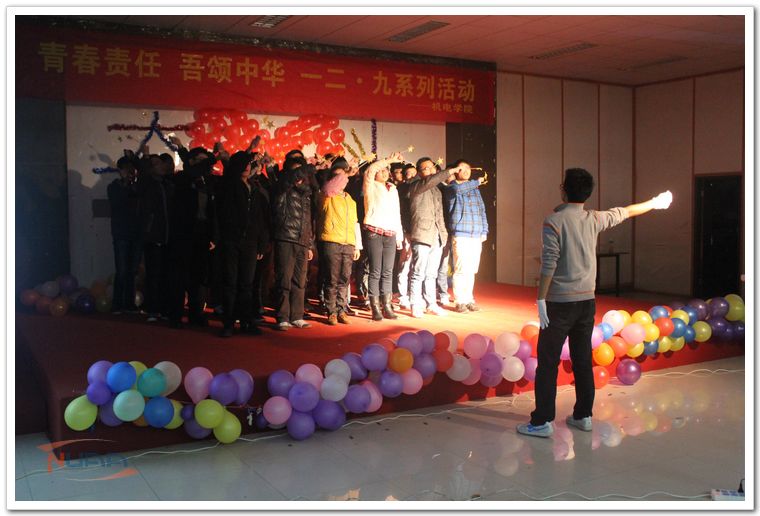 12月5日晚,机电学院在艺术中心二楼多功能厅举办了“一二•九”红歌赛,本次活动以“青春责任,吾颂中华”为主题,旨在加强同学们的责任感、使命感,为中华崛起而奋斗。 本次大赛,每个班级出一个节目,有的班级用《我爱你中国》来赞美我们的祖国;有的班歌唱属于南航人的爱国之心《胜太西路的日子》,还有的班用《星星点灯》唱出自己对光明前程的向往。最后培优班用《红旗飘飘》将整场晚会推向高潮,唱响了青春,唱出了梦想。