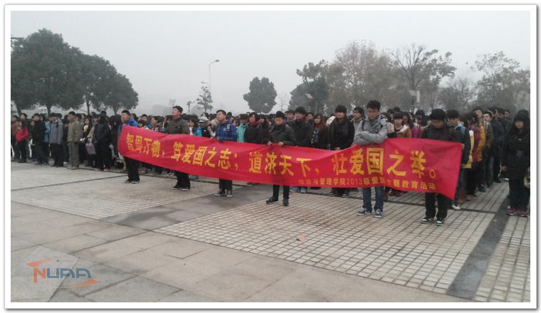 为弘扬爱国主义精神,纪念“一二•九”爱国运动,12月9日早上,经济与管理学院在将军路校区国旗广场举行升旗仪式,全体学生和辅导员到场参加。 持续的雾霾天气没有阻挡同学们的热情,大家都早早来到升旗地点。主持人宣布升旗仪式正式开始,英姿飒爽的国旗护卫队队员们护送鲜艳的五星红旗进场。伴随着庄严的《中华人民共和国国歌》,五星红旗冉冉升起,迎风飘扬。在场的每一个人向国旗行注目礼,深怀对祖国的无限热爱和崇高敬意。