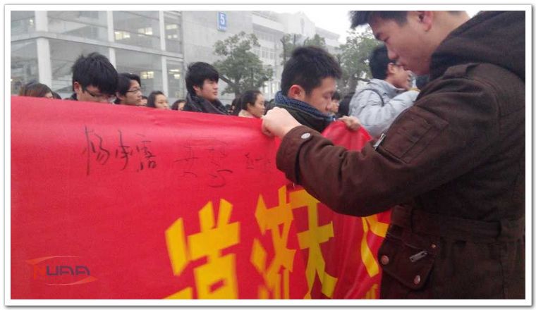 随后,在场全体人员进行了国旗下宣誓,党员同学还作为代表在主题横幅上签名。升旗仪式在全体同学《歌唱祖国》的歌声中结束。