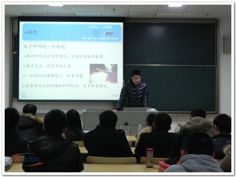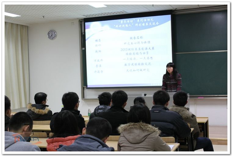 2013年12月10日晚,由自动化学院研究生会主办的“紫冬话坊”系列活动之“科研同路人”科创精英交流会活动在A18楼218教室顺利举行。本次活动邀请到我院硕士研究生任仁、李洁、万骏炜、赵阳以及博士研究生许德智五位学术精英为到场同学们作报告,研究生辅导员刘斐文老师也莅临现场出席了本次活动。 讲座开始前,刘斐文老师为交流会致辞。刘斐文老师在致辞中提出希望同学们能够珍惜与各年级科创精英交流的机会,提高学术素养,开拓科研视野。刘斐文老师致辞完毕后,自动化学院“紫冬话访”系列活动之“科研同路人”科创精英交流会活动正式开始。