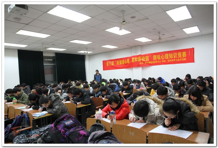 12月11日晚,由我校心理健康教育中心主办、材料科学与技术学院承办的“筑健康心理,建和谐校园”心理健康知识竞赛初赛在将军路校区举行。共有来自12个院系的130余支队伍参与了此次初赛的角逐。 由于赛前报名队伍众多,此次初赛在6号楼四个教室同时进行。初赛以团队答题为主要考核形式,试卷分基础知识,案例分析,图书电影分享推荐三张试卷,由团队分工答题,每十五分钟可队内交换试卷。至晚上八点,所有队伍均答题结束并上交试卷。