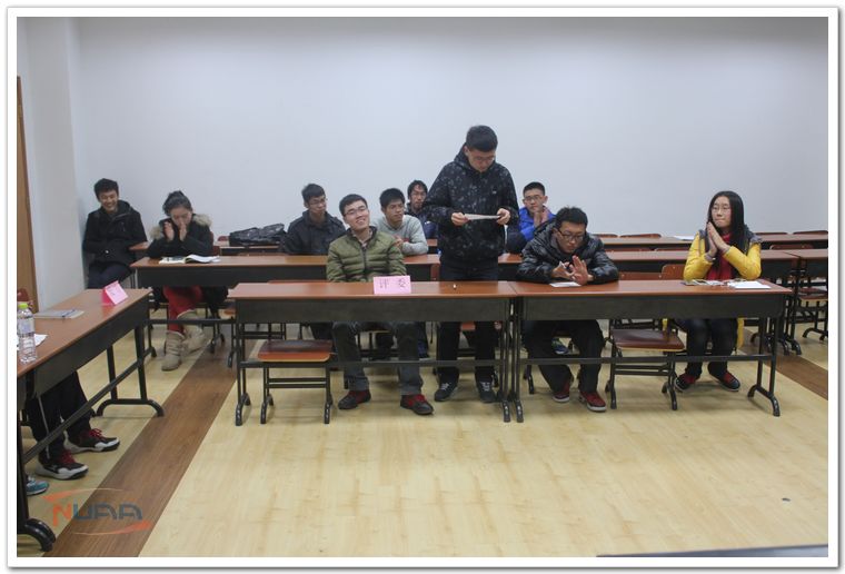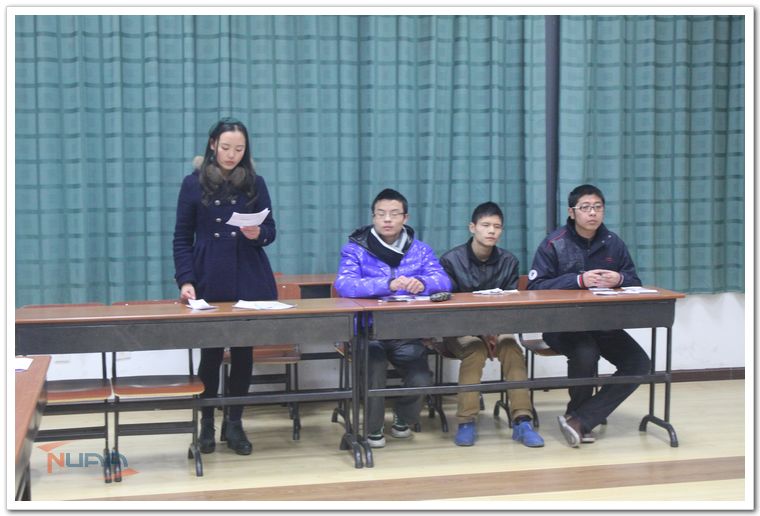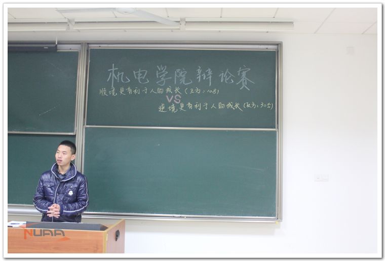 12月14日下午,南京航空航天大学机电学院大一辩论赛半决赛两场同时进行,又迎来了观众激情的欢喊。第一小组,正方:108(顺境更有利于人的成长)VS反方:305(逆境跟有利于人成长);第二小组,正方:303(IO诚可贵)VS反方:105(EQ价更高)。 第一小组:第二辩手(胡磊)一开始就表现出色,论据充分,辩论流利。可以看出准备很充分。然而,反方也穷追不舍,沉着面对。两方交战激烈,不相上下。在自由辩论期间,正方思辩(刘浩洁)总结完整,指出了反方许多问题,将辩论推向了高潮。