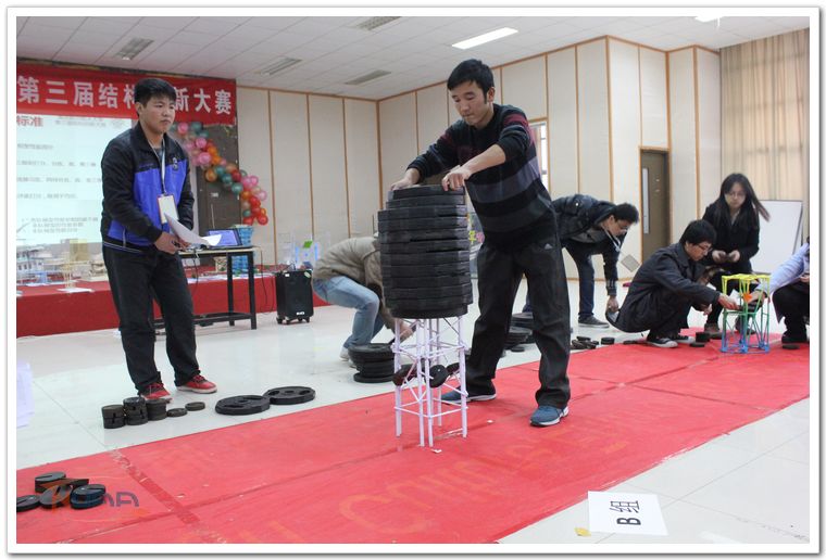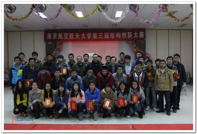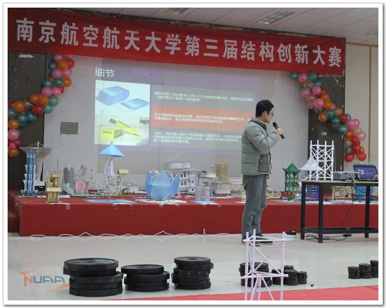 12月15日,由教务处、校团委、学生处主办,航空宇航学院承办的南京航空航天大学第三届结构创新大赛决赛在将军路校区艺术中心举行。航空宇航学院副院长沈星、土木工程系吴瑾老师、唐敢老师、程晔老师担任大赛评委。 本届结构创新大赛从报名开始到决赛共历时25天,全校共有包括留学生在内的600余名同学、260余支队伍报名参与比赛。本届比赛在前两届大赛成功举办的基础上,创新比赛形式除A4纸制作结构的承重比赛以外,增设不限形式、材料的模型展示组,创新结构及动手制作的魅力也得到了众多同学们的关注,比赛也将从中选拔两支队伍,推荐参加2013年度江苏省结构创新大赛。