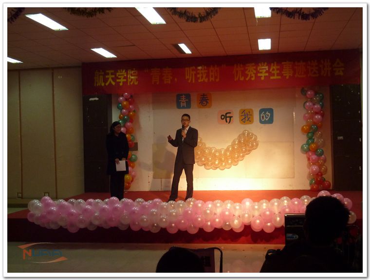 12月18日,航天学院在将军路校区举行“青春,听我的”优秀学子送讲会,活动邀请了多位2013年度校长特别嘉奖获得者参加,他们与航天学院学子分享了他们的成长历程。参加此次活动的有航天学院大一全体学生以及2012、2013级辅导员范伟,2011级辅导员刘洁。 下午,多功能厅里已经座无虚席。由于事先进行了良好的宣传,同学们对于今天的嘉宾已经有了初步的了解,活动与下午四点在大家的期盼中准时开始。主持人先简单介绍了本次活动,话不多说,便直奔主题。