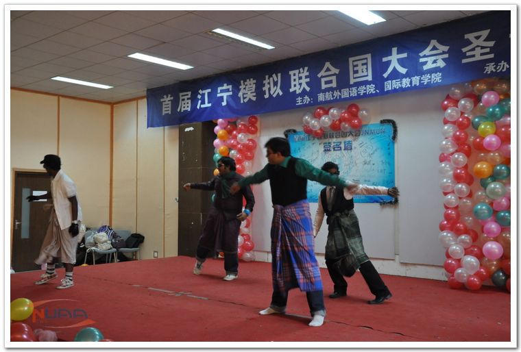 开幕式后,首届江宁模拟联合国大会分中文场和英文场各自举办了会议。会上,代表们发挥水平,围绕议题唇枪舌战。其中,中文场的朝鲜代表让大家印象深刻,他们对于朝鲜的深刻理解和出色的角色扮演十分到位;美国代表运筹帷幄,表现出了超级大国应有的风范。在英文场,缅甸、卢旺达、意大利、巴基斯坦等代表均发言积极,各自代表其扮演的国家争取着话语权和权益,德国、俄罗斯代表虽然发声不多,但句句切中要点,推进了整个会议议程。代表们表现活跃,主席团的各位代表也秉承公平公正的原则,充分给每一位代表表达观点的机会,引导着会场的秩序。而辛勤的志愿者们也一丝不苟地做着自己的工作,保障着大会的进程。会议期间,本届模联还按照惯例举办了交流午餐会,代表们戴上大会配发的面具,谈笑风生。交流会上,留学生们带来了精彩的舞蹈表演感染了与会同学,大家纷纷上台,和留学生们一起歌舞。