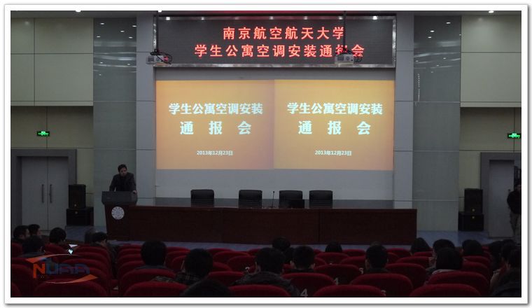 2013年12月23日下午,我校在将军路校区主楼报告厅召开学生公寓空调安装通报会,就空调的安装进度、租赁方式、费用收取等事宜面向师生进行通报,并对师生关注的问题进行现场解答。国资处处长江波、副处长李勇、学生处处长王晖、副处长陈修文,各学院党委副书记,全体辅导员及各学院学生代表参加了通报会。
