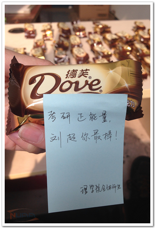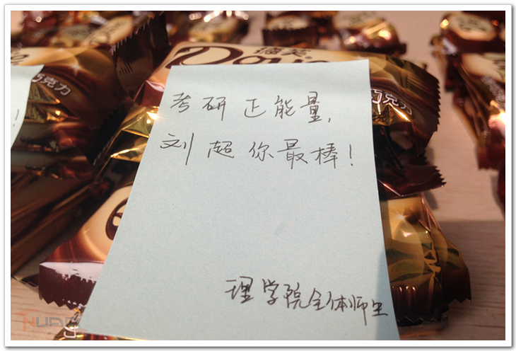 2014年全国硕士研究生入学统一考试将于1月4日至5日举行。今年,理学院报研究生考试人数达57人,人数创理学院历年来最高。为了给考研学子打气加油,理学院为2014届每一名考研学生精心准备了一份“正能量”礼包:四块“正能量”巧克力,保证考研学生在四门考试里精力充沛,努力拼搏;一句便签祝福,宿舍好友为考研学子们送上最真挚的祝愿;理学院学子通过学院人人公共平台,发起“为考研学子加油”活动,为2014届考研学生送上一条条”加油“问候,共同祝福考研学子取得好成绩;考试当天清晨,理学院学生准备的"人肉闹钟"将准时响起,为考研学子送上清晨的第一声祝福。