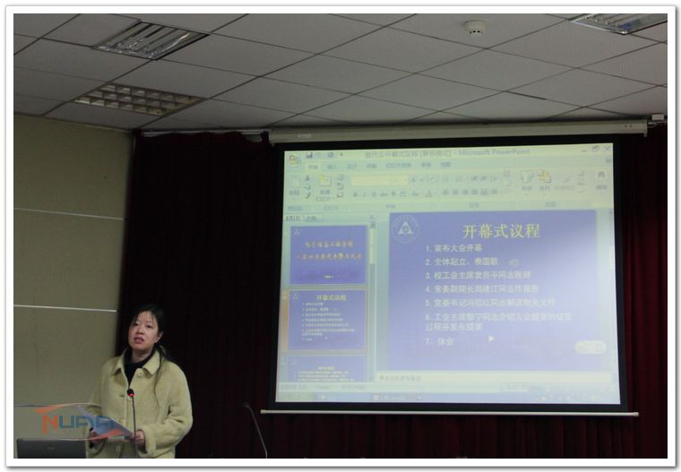 1月9-10日,电子信息工程学院召开学院1届4次教代会暨工代会,院长贲德院士、校工会常务副主席袁贵平出席大会开幕式,院领导和全体教职工参加会议。 袁贵平在开幕式上致辞,代表学校对大会的召开表示热烈的祝贺。学院常务副院长周建江做了关于学院特色发展的报告,从背景与现状、面临的瓶颈、建设目标、建设思路和可行性分析等方面详细阐述了学院特色发展的总体布局和任务,并形象地用“如何成长为一棵大树”作为启发和共勉,他还对学院2013年度财务收支情况向大会做了说明。党委书记冯绍红解读了学院集体活动管理办法和学院工作流程文件的相关内容。院工会主席黎宁介绍了教代会提案的征集过程并发布提案。
