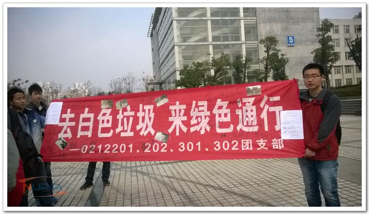 中午12点,在各班委的组织下,四个团支部的同学们在樱花广场挂起了条幅并展示了此次活动照片,分发倡议书,呼吁同学们不乱扔垃圾,并注意垃圾分类问题,保护环境,过低碳生活。