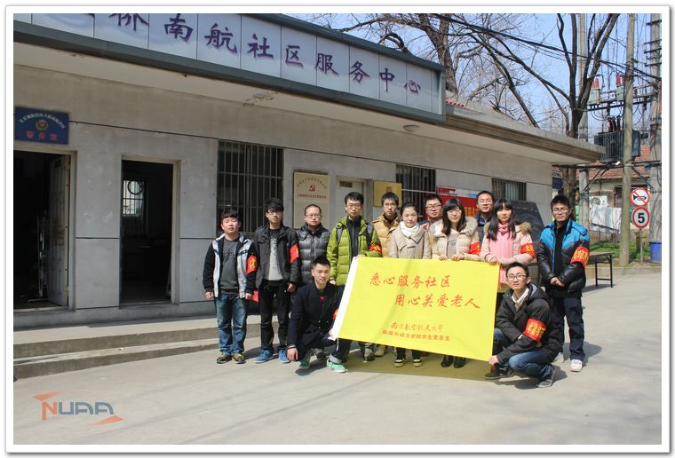 2014年3月5日中国青年志愿者服务日,能源与动力学院党总支联合南航卫桥社区开展了“悉心服务社区 用心关爱老人”学习雷锋志愿服务活动。 当天上午一行13名党员准时到达南航卫桥社区,按照既定任务安排, 三组志愿者分别前往三位孤寡老人的家里,为他们做一些力所能及的事。第一组志愿者拜访了一位90高龄的老奶奶。老人虽然年事已高,但是身体很健康,精神状态也特别好。值得一提的是,老奶奶的毛笔字写得非常好,看见志愿者特地去拜访她,老奶奶很高兴地领着志愿者们欣赏了她的很多书法作品。第2组志愿者拜访的也是一位老奶奶。由于今天天气很好,应老人的要求,志愿者们陪她去了一趟苏果超市,买了一些日常用品。之后志愿者们还陪她在小区里散步、聊天,直到快吃饭的时候才送老奶奶回家。老人说,她因为腿脚不是很方便,所以平日里也难得出来走动,今天能在外边呆那么久真的很是感谢。另一位老人告诉志愿者,她希望到社区旁边的梅花谷风景区看梅花。于是3位志愿者就轮流推着坐在轮椅上的老人去梅花谷逛了一上午。虽然3位志愿者推轮椅推得手腕酸疼,但看到老人一路上都非常开心、有说有笑,大家也就心满意足不觉得有多么累了。