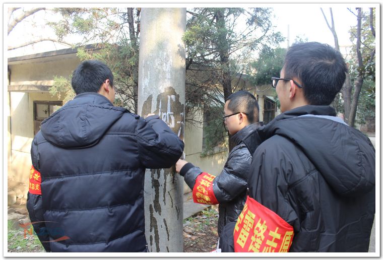 在陪伴老人之余,剩下的7位志愿者还在社区开展了“清除路边牛皮癣”的社区清洁卫生服务活动。7位志愿者分组出击,相互配合,使用毛刷、铁铲等工具从南至北将社区电线杆上的小广告全部一扫而光。