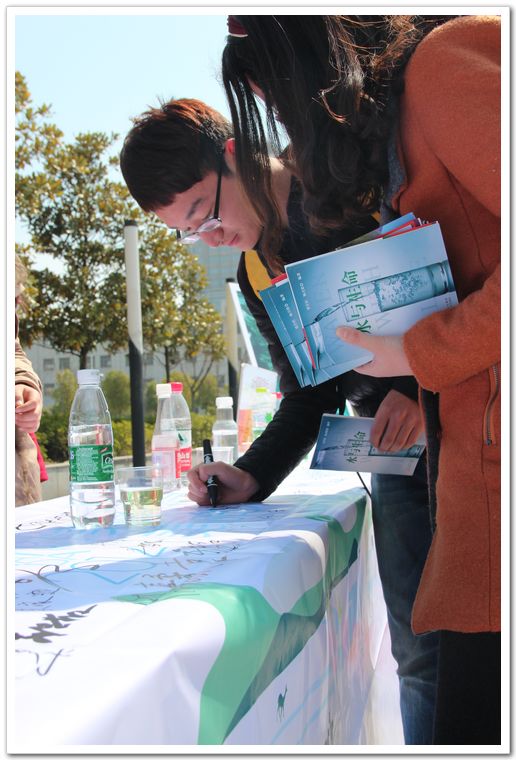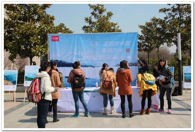 为了贯彻两会期间提出的“向污染宣战,重点保护好雪山等珍稀水源地”的口号,以3月22日世界水日为契机,经济与管理学院2012级文强班以“美丽的地球,美丽的水”为主题,在艺体广场组织了宣传环保节水的志愿服务活动,使同学们了解中国的珍惜水源地,呼吁大家节约用水,健康用水,珍惜水资源。