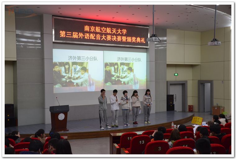 近日,南航第三届外语配音大赛在将军路校区成功举办。“在你的舞台,念出你的专属对白”。现场配音精彩不断。 经过初期的多轮淘汰,最终有9支队伍进入决赛。标准流利的英文发音、美轮美奂的英文歌声、精彩绝伦的电影片段、搞笑新颖的原创台词,引起场下观众阵阵掌声。在第一轮自选配音中,yuri tang团队配音的《冰雪奇缘》片段,他们拥有一口标准的美式英语,感情丰富地配出了各个角色的色彩。两位同学深情演唱牢牢地抓住了观众的耳朵,不仅配音精彩,而且唱的悠扬。one shot团队所配音的《mind your language》片段,与别队标准的音调不同,他们刻意地去模仿片段中的各国英语口音,演绎出了一副世界各地人民汇聚于同一课堂学习英语的滑稽场面。黑山羊团队配音时充沛的感情,将人物的情感纠葛全部通过语音语调的变化展示出来。give me 5团队激情的摇滚演唱,将配音大赛推向高潮。