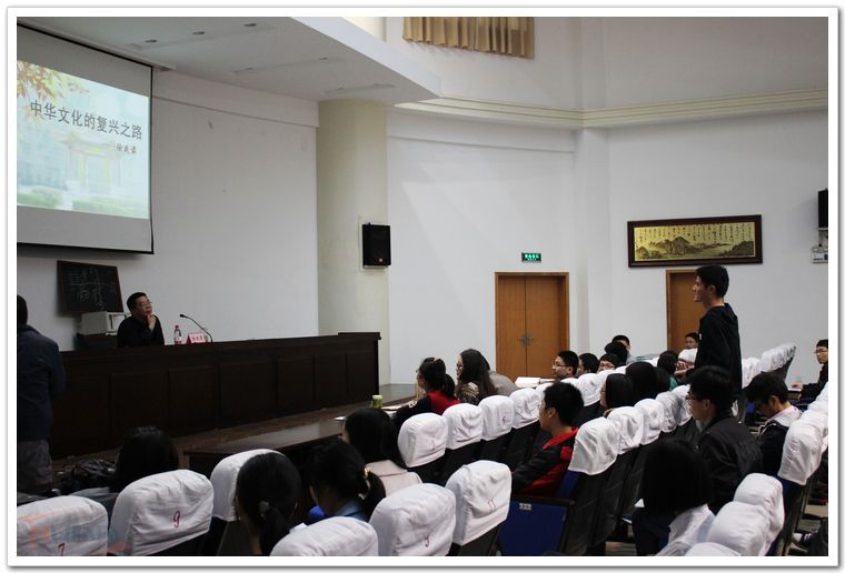 互动环节中,徐战前对同学们的问题非常感兴趣,并称赞大家“很有想法”。他表示对南航学生对于中国传统文化能够表示出如此高的热情感到十分欣慰!值得一提的是,在提问环节中现场还有一位从南京林业大学的同学为了聆听讲座特地做了一个多小时的地铁赶来,这样的求知欲深深打动了徐战前。整个讲座气氛十分活跃,同学们纷纷表示听完了徐战前的讲座自己收获颇多,对中华文化又有了深刻的认识。徐战前鼓励在座同学要融合历史,开阔眼界,吸取精华,做一个情志高远,有思想、有报复,有文化、有担当的中华文化的接班人。