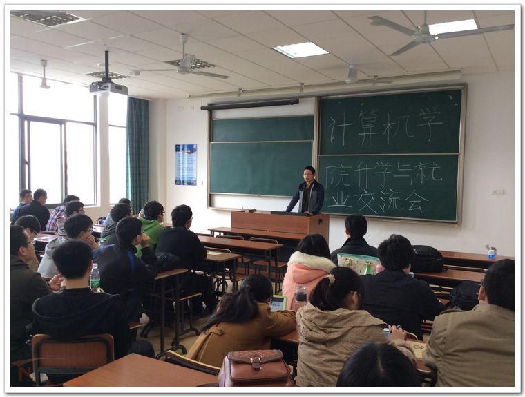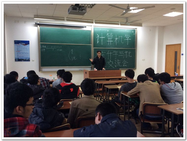 3月25日,计算机学院“未来去哪儿”升学就业交流会在将军路校区举办,计算机学院副教授沈国华、2011级辅导员刘彦辰,优秀毕业生代表以及软件工程系全体学生到场参与。 在主持人简短的开场介绍之后,2014届毕业生王潇逸就开始讲述自己的保研之路。他就我校保研工作流程、外校保研申请流程,申报的难以易成度和申报过程中的注意事项作了详尽透彻的讲解。他强调,在保研之前要有一个确定的目标,做好相关准备。他的讲述深深地吸引了意欲保研的同学,同时也为同学们解答了一直以来的疑惑。接着,即将走上考研复试的毕业生王梓分享自己的考研经验。王梓就考研复习过程中的生活习惯,各科目复习时间点,以及如何进行复习,甚至如何处理考研心态这一方面作了深入的讲解,他不断叮嘱在坐同学,考研贵在坚持,要坚定信念、明确目标,坚持到底。他幽默的讲述形式让大家阵阵掌声,也为考研的同学指明了一条光明大道。随后,已经拿到华为公司OFFER的毕业生盛杨金,与大家一同分享了他找实习,找工作的经历。他从简历制作到公司面试,再到进公司后的心态处理上提出非常详尽的建议,他提醒大家要适应职场局面,摆好心态,要有百折不挠的毅力。