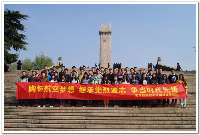 4月5日是中华民族传统节日清明节。为充分表达南航学子对革命先辈的崇敬和缅怀之情,4月3日自动化学院50名青年学生代表南航学子参加江苏省暨南京市各界清明凭吊革命先烈活动,并在雨花台开展“胸怀航空梦想,继承先烈遗志,争做时代先锋”主题党日活动。 上午10时,雄壮的中华人民共和国国歌声响彻雨花山冈,省暨南京市各界凭吊革命先烈活动正式开始。在军乐团演奏的激昂深情的《献花曲》旋律中,仪仗兵托起由中共江苏省委、江苏省人民政府、中共南京市委、南京市人民政府、老红军老战士老干部代表、烈士亲属代表、各界干部群众、在宁高校师生、中小学师生分别敬献的花篮,正步缓缓走向烈士纪念碑,将花篮摆放到纪念碑基座前。一朵朵盛开的鲜花,寄托着人们对革命先烈的无限敬仰和无尽怀念。 “继承先烈遗志,发扬奉献精神,胸怀航空梦想,立志逐梦蓝天,与时俱进,开拓进取,踏实努力,刻苦学习,夯实基础,加强修养,争当时代先锋!”集体凭吊活动结束后,50名南航学子在革命烈士纪念碑前集体宣誓以表达对革命烈士的崇敬之情。 活动当日中央人民广播电台记者就社会主义核心价值观问题采访了我们的学生,自动化学院2011级本科生党支部书记朱浪说道:“作为一个大学生,也作为一名党员,更作为一名党支书,我们一直努力践行12个字,铭记历史、坚定信仰、努力学习。不但铭记先烈为了祖国统一富强,抛头颅,洒热血的历史,也要记住屈辱史、失败教训的历史。我们当代大学生必须要有担当,就是以国家为己任的爱国心、责任感和不畏艰险、努力拼搏的担当。”