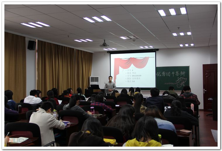 4月初,经管学院团委组织参评“优秀团员干部”的同学分年级进行了述职答辩,参评的候选人都是由各级学生组织和基层团支部推荐的,由各年级班主任老师、辅导员老师、各支部学生代表共同投票评选。