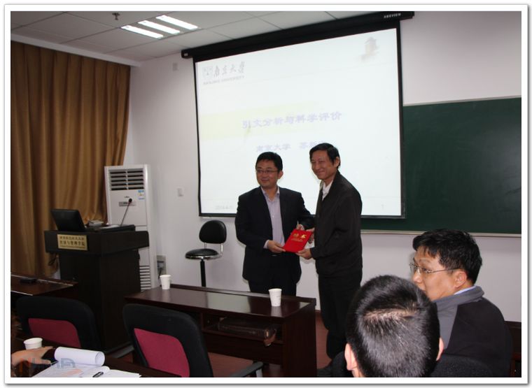4月11日,我校举行聘任仪式,教育部长江学者特聘教授、南京大学高层次学科带头人、南京大学信息管理学院苏新宁教授被聘为我校兼职教授。经管院信息管理与电子商务研究所所长马静致欢迎词,经济与管理学院院长周德群苏新宁颁发聘书。 苏新宁长期从事信息管理、情报学方面研究,是国家社会科学基金学科规划评审组专家,江苏省哲学社会科学基金项目评审组专家,南京市专家评审委员会委员,《情报学报》、《情报科学》、《现代图书情报技术》等10余种学术期刊的编委,中国人民大学、中南大学、南京农业大学、南京工业大学等高校兼职教授。苏新宁成功设计并研制了我国第一部社会科学引文索引——《中文社会科学引文索引》(CSSCI),填补了我国社会科学引文索引的空白(人民日报报道)。出版了《中国人文社会科学学术影响力报告》系列著作(三部,共计600万字),三本书的出版被人民日报、光明日报、中国新闻出版报等国家及媒体报道,开创了社会科学成果评价的新篇章,是一项开创新的研究,三次报道该成果填补了国内学术资源建设的空白。 聘任仪式后,苏新宁为我校经管学院管理科学与工程等相关学科专业的师生作了题为“引文分析和科学评价”的学术报告。在报告过程中,苏新宁结合自身的科研经历,从学术资源评价、学术主体评价、学术特征搜索、学科热点发现等六个方面深入浅出的介绍了引文分析的学术价值,在师生中引起了很大反响。报告结束后,在场的同学与苏新宁进行交流,也对CSSCI表现出极大的兴趣。苏新宁一一解答同学的提问,并鼓励勇于尝试使用CSSCI,发现引文的魅力。最后马静和苏新宁就论文相似度匹配问题进行了深入交流。