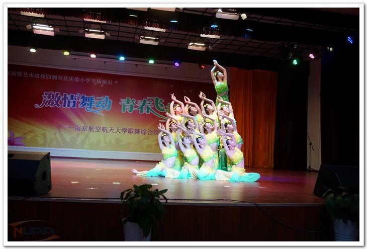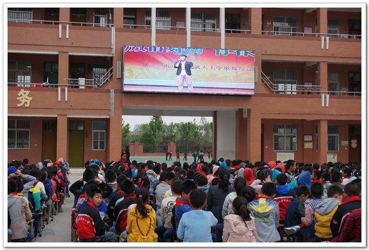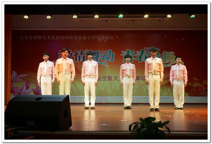4月25日,作为江苏省高雅艺术进校园中标单位,我校大学生艺术团继苏州之行后,走进泗阳县实验小学,为那里的师生送上精彩的文艺演出。 演出在学校的报告厅举行,报告厅里只能容纳700余人,为了让更多学生观看演出,学校利用教学楼前的大电子屏对演出进行现场直播,组织全校3000余名师生在户外广场上观看。艺术团的学生们不顾路途的疲惫,以最饱满的热情投入演出,展现了南航学子阳光、向上的精神风貌。