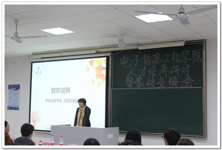 4月26日,为响应学校创新人才培养机制改革,切实提高人才培养质量,电子信息工程学院举办了人才培养研讨暨家长开放日活动。此次活动由家校共育研讨会、班主任辅导员家长代表座谈会、“我和父母的晚会”三部分组成。 研讨会上,电子信息工程学院院党委书记冯绍红代表学院致欢迎辞,深刻阐述了活动的背景及意义,指出家长开放日活动是学院“全员育人”、“全过程育人”的具体体现。党委副书记季海群谈了近几年大学阶段家校共育的探索和成效。心理健康教育中心主任杨雪花讲解了家长应如何把握大学生心理。12级辅导员丁亮向家长介绍了年级取得的成绩等总体情况,10级辅导员冷阳介绍了学院毕业生去向。江苏省先进班集体0412204班学习委员陆思文作为学生代表发言,向家长们介绍了班级良好的学风和丰富多彩的班级活动,家长代表张继红从三个方面阐述了开展家庭教育的方式方法。
