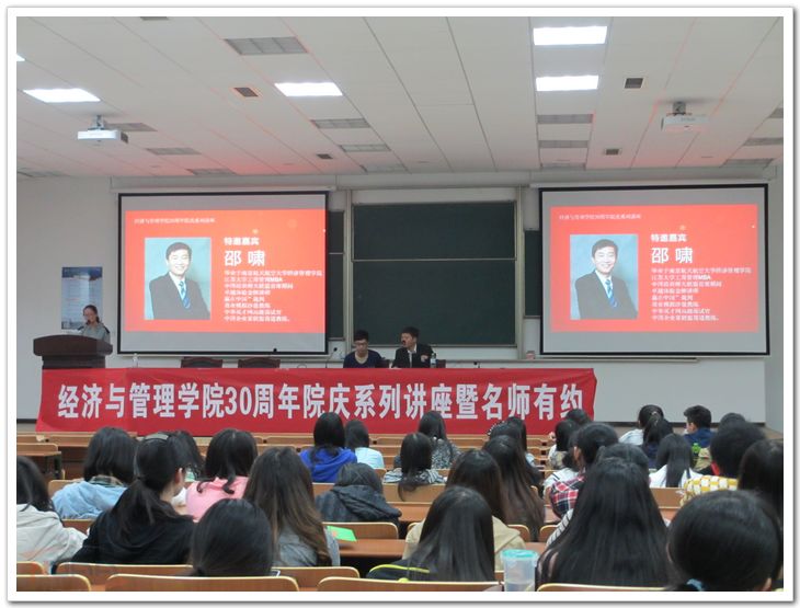 4月24日,经济与管理学院30周年院庆系列讲座暨名师有约之“定位vs认知”职业生涯规划讲座在将军路校区举行。经济与管理学院2003届工商管理系毕业生、中国培训师大联盟首席顾问、现人合正道培训机构高级培训顾问邵啸应邀参加,针对职业选择与定位与同学们进行探讨。经管学院2012级辅导员刘旭、2012级全体学生参加本次讲座。 邵啸的讲座由引导同学们做两个平常不习惯的动作开始,向同学们阐述“换个路子接受事物通常比忠于自己的习惯有更多收获”的道理;并通过接下来的两组限时数学题告诉我们,“当你要为事情的结果负责时,一定要使自己的习惯发生改变”。他通过这一组互动训练一下子拉近了和同学们之间的关系,在轻松的氛围中,他将自己的亲身经历和十年培训经验向同学们娓娓道来。 邵啸通过六大职业方向:公务员、技术专家、综合性人才、销售人员、管理人才和创业者,向同学们一一阐明每个方向所需要具备的能力和可能面对的问题。邵啸说,我们通常觉得很难跟家人沟通是因为互相依赖,而违反公司的规则就可能会失去工作。公司是一个实现职业梦想的场所,是一个价值交换的场所。由此同学们陷入对职场为人处事的思考,也引出了有关职业选择问题的探讨。 在这一模块中邵啸首先以自己参加马拉松比赛的经历说明坚持自己职业选择的重要性,并以两个“山中遇虎”的小故事分别向同学们阐述什么是比较竞争力和核心竞争力。那么如何进行职业选择呢?邵啸由三个问题“你希望自己在别人眼里是什么样的人”“你的家庭希望你成为什么样的人”“你目前的能力允许你成为什么样的人”引出自己的观点:职业选择是各方面综合的聚焦。 讲座的最后邵啸留给同学们两句话:“没有什么可以阻挡你对成功的渴望”“对于我们而言,优于别人并不高贵,真正的高贵是优于过去的自己”。同学们纷纷表示会找准自己的职业定位,在校园里形成知识储备,有目标、有自信地走向职场。