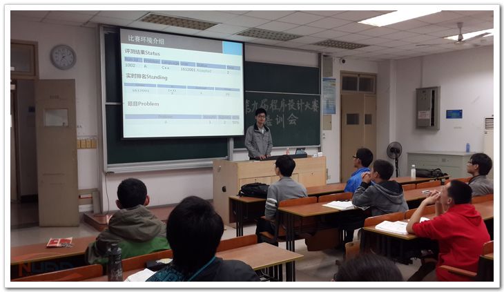 4月24日,计算机学院在将军路校区举行第九届程序设计竞赛培训会。会议由校ACM队负责人、本次大赛命题人郑睿宇和计算机学院大学生科协竞赛部部长朱延龙主持,2011级辅导员刘彦辰和近百余名本次大赛参赛选手到场参与。 郑睿宇以本次大赛网上ACM竞赛平台为例,从如何提交代码、系统反馈的英文语意、参赛选手易犯的错误、比赛排名评测方法以及试题大致范围入手,亲自上机演示,生动直观地为选手们讲解,多方面深入详细地解决参赛选手们的疑难问题。会上,参赛选手就其关心的ACM算法编译等问题与郑睿宇交流。参与培训的同学对程序设计思想、算法内涵有了新的认识,受益匪浅,有信心在本次比赛取得良好成绩。朱延龙解析了平台注册和其他平台使用的注意事项,着重强调了此次比赛的详细时间地点以及大赛注意事项,并预祝各位参赛队员取得好成绩。 据悉,本次大赛旨在扩大ACM程序设计竞赛影响力,培养学生的科技创新意识,增强学生运用计算机分析问题并通过编程解决问题的能力,吸引越来越多的学生喜爱编程并投身到程序设计中来。现已有150多名同学报名参赛。