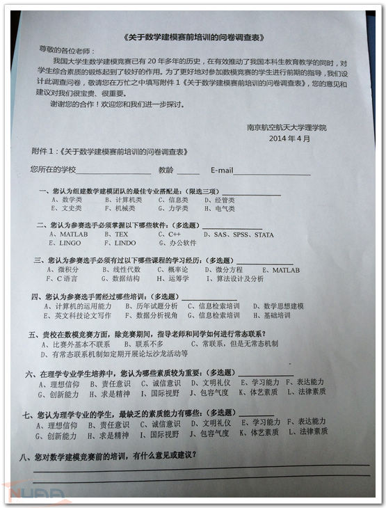 4月29日、30日间,全国研究生数学建模指导教师研讨班在我校举行,共有来自全国50所高校60余名数模竞赛指导老师参加研讨。理学院以协办“全国研究生数学建模竞赛指导教师研讨班”为契机,面向参会老师开展了数模竞赛组织、培训及理学学子素质能力培养重点的调研活动。 会议期间,共发放《关于数学建模赛前培训的问卷调查表》61份,回收有效问卷55份。问卷上对数模竞赛的最佳专业搭配、参赛选手必须掌握的软件、课程和培训等问题进行了调研。调查结果显示,92%的指导教师认为,数学类、计算机类为数模团队最佳专业搭配中必备专业,MATLABA、LINGO、SAS、SPSS、STATA软件知识高居参赛选手必须掌握的软件前列。近期将进行数模竞赛校赛,本次调研结果为有效指导学生组队和进行知识储备提供了方向,学院将针对性开展竞赛准备及组织工作。 问卷中还对理学专业学生素质培养重点进行了调查:哪些素质较为重要,理学学子最缺乏社么素质等。调查显示,老师们普遍认为创新能力为学生需重点培养的能力,表达能力为理学学子最欠缺的能力。调查结果对理学院学生素质能力平台的搭建具有参考意义。 ![]()