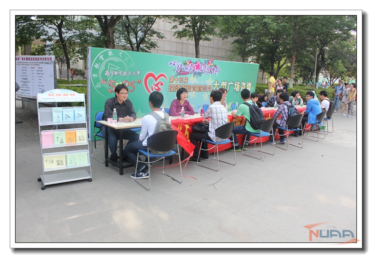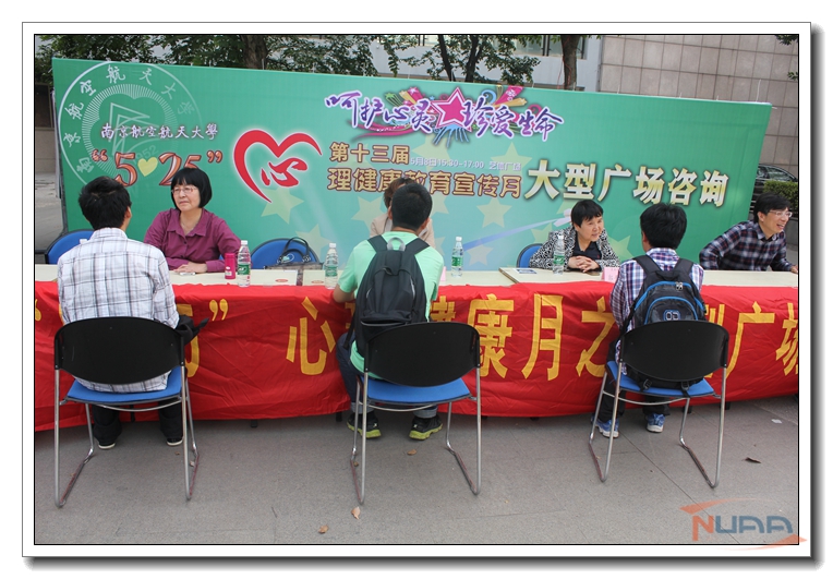 为了在南航学生中营造重视心理健康、呵护心灵成长的氛围, 5月8日下午,我校第13届“5.25”心理健康教育宣传月大型广场心理咨询活动在将军路校区艺体广场举行。本次活动由校学生处、研究生院主办,心理健康教育中心承办。我校学生处副处长陈修文、江宁大学生城心理健康教育基地主任、南医大心理健康教育中心的郑爱民、仙林大学城心理健康教育基地主任、南师大心理健康教育中心的周红、东南大学学生处副处长心理健康教育中心主任郭晋林、南京信息职业技术学院心理健康教育中心主任陶爱荣、南京医科大学心理健康教育中心王志琳博士及我校心理健康教育中心的老师参加了此次活动。 此次活动围绕“呵护心灵,珍爱生命”的主题,分为心理咨询和心理测试两个区域进行。在广场心理咨询区,来自多所高校心理咨询中心的专家组成了强大的心理咨询团队。同学们纷纷勇敢地走到咨询台前,向心理专家敞开心扉,诉说自己的烦恼。心理咨询专家则用尊重、理解、接纳的友好态度接待每一位来访同学,耐心聆听同学们的心声。据现场统计,同学们的来询问题主要集中在学习压力、人际交往、恋爱受挫、时间管理等方面,专家们运用专业的理论与技术,帮助同学们加深了自我认识、学会了积极应对压力的技能技巧。