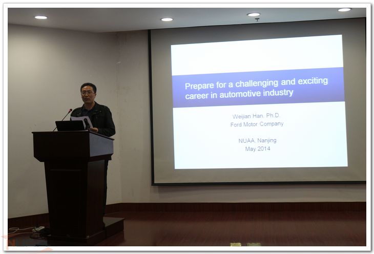5月11日晚,美国福特汽车公司亚太区研究与技术主管韩维建博士来到我校做客企明星大讲堂,为师生作了题为:“Prepare for a challenging and exciting career in automotive industry(欢迎来到充满挑战激动人心的汽车行业)”的专业报告。能源与动力学院副院长崔海涛、党委副书记王亚彤,福特汽车工程研究(南京)有限公司人力资源部经理葛蓉蓉及部分公司成员参加了报告会。